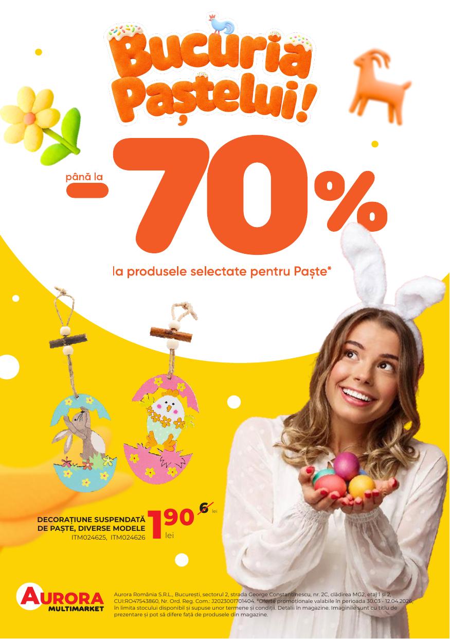 Între 30 martie și 12 aprilie, dă click, răsfoiește broșura și descoperă reduceri de până la 70%. Produsele sunt disponibile exclusiv în magazinele Aurora Multimarket, în limita stocului disponibil.